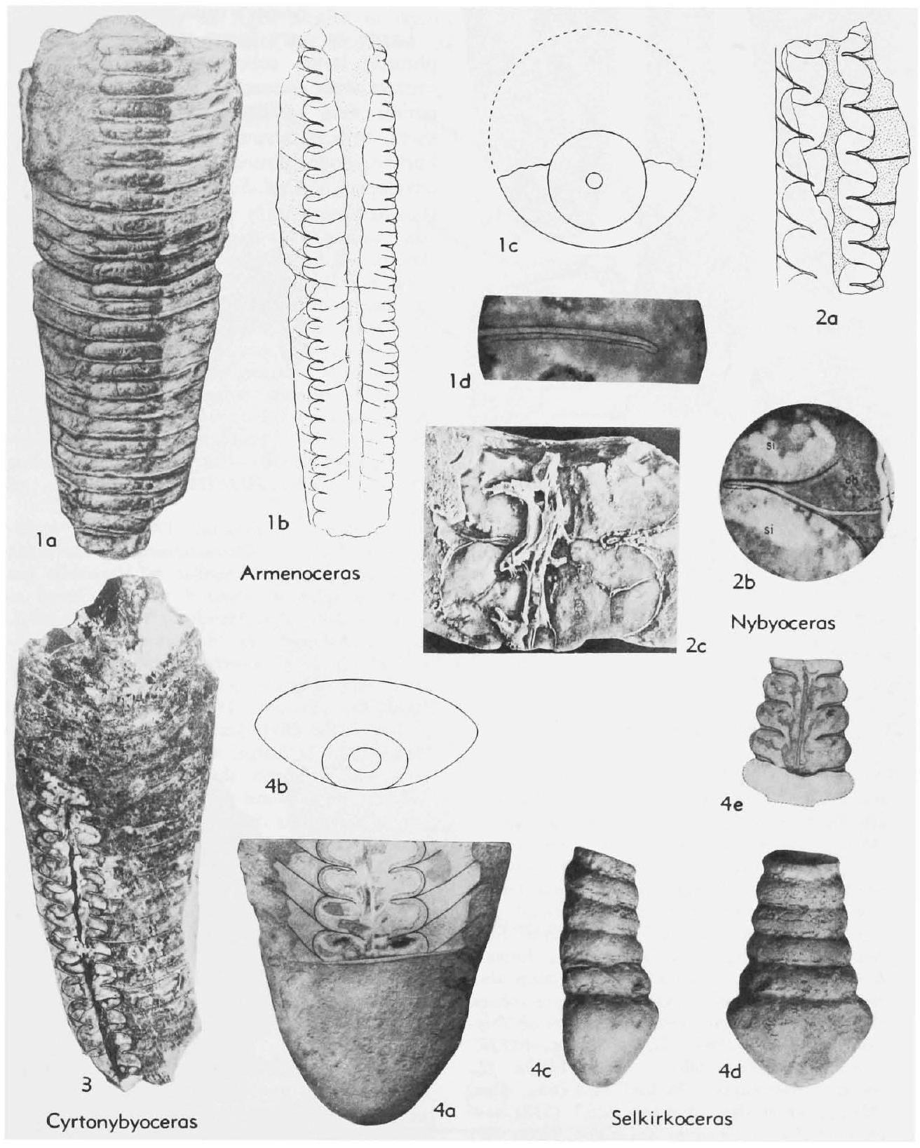Fig. 146, 1a-c. A. arcticum (Troedsson), M.Ord. or ?U. Ord., N.Greenl., 1a, dorsal side of weathered specimen, x0.5, 1b,c, lat. long. and transv. secs., x0.5 (194). -- Fig. 146, 1d. A. richardsoni (Stokes), Ord., Can., recumbent septal neck, x5 (78)